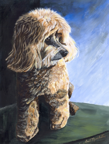Poodle posing on sofa.